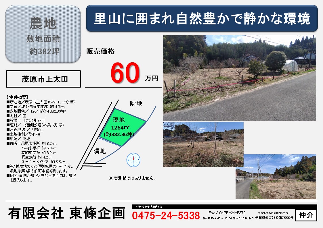 茂原市上太田1349-1、-2 グーグルマップで確認するなら ➡ 35°28'52.2"N 140°16'00.7"E ※表示されるアイコンは付近住所に所在することを表すものであり、実際の物件所在地とは異なる場合があります。弊社までお問合わせください。 Googleマップで開く |